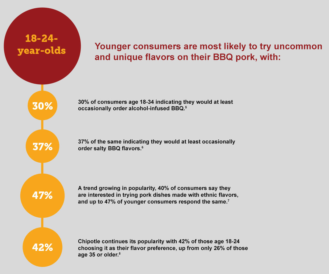 Consumers prefer smoky-flavored pork items, with 60% indicating they would at least occasionally order smoky pork. Other preferred flavors include sweet and hickory.2