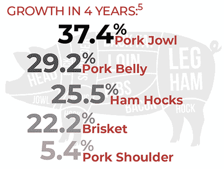 Probably second in popularity, hams are considered another holiday favorite. According to The Washington Post, 15% of the U.S. ate ham during Thanksgiving.4 This is equivalent to 24.75 million pounds of ham! But hams do not have to be the only other center-of-plate feature during the holidays. By offering more “unconventional” proteins, there are still ways to add unique flavors. Whether it’s a rack of ribs, smoked brisket, roasted pork belly, slowcooked pork shoulder and so much more, these unique proteins are truly versatile and can enhance and differentiate a holiday meal.