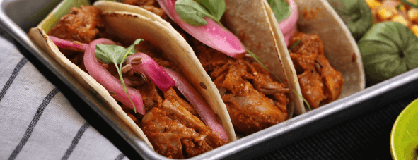 A slow-roasted pork dish marinated in acidic citrus with annatto seed, wrapped in a banana leaf; from the Yucatán Peninsula of Mexico