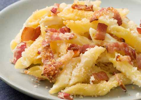 1. Heat convection oven to 350°F. Cook pasta according to package directions; drain. Cook bacon until crisp; drain.