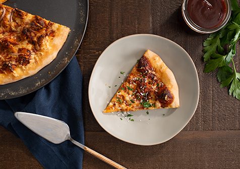 5. Place the sauced pulled pork pieces evenly over the cheese, add red onion pieces and sprinkle remaining 1/4 cup mozzarella over the top.