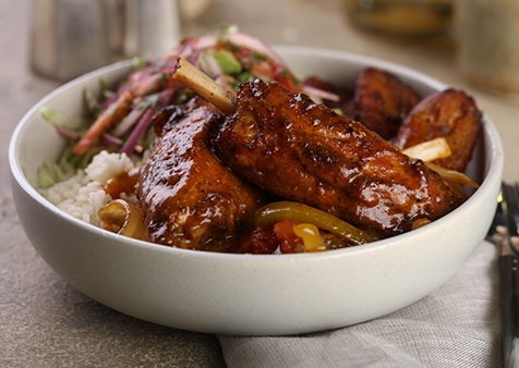 - In another mixing bowl, add fried pork shanks, and add enough of Black Pepper Glaze to coat them well, tossing carefully to ensure every piece is very well coated.