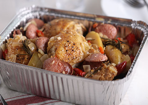 - Remove chicken and add sausage, onions, garlic and peppers, and sauté for 4-5 minutes.