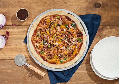 2. Top pizza crust with bbq sauce. Arrange bell peppers, onion, bacon and pulled pork over sauce. Sprinkle with cheese.