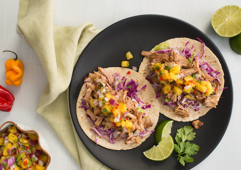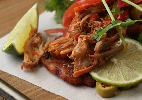 - Top each cake with your favorite guacamole, then crispy Roasted & Seared Pork Shoulder, and finish with a chipotle crema and chopped cilantro.
