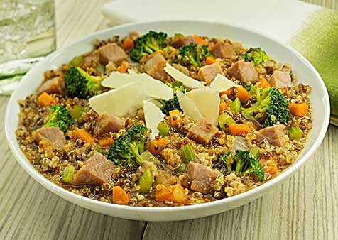 - Add chicken stock, ham, quinoa, and tomato purée; stir to combine.