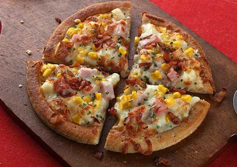 5. To build pizza, use roughly 6 oz. of cream sauce with potatoes as base, and spread evenly in a circular motion onto pizza crust. Add shredded mozzarella, corn and ham to pizza.
