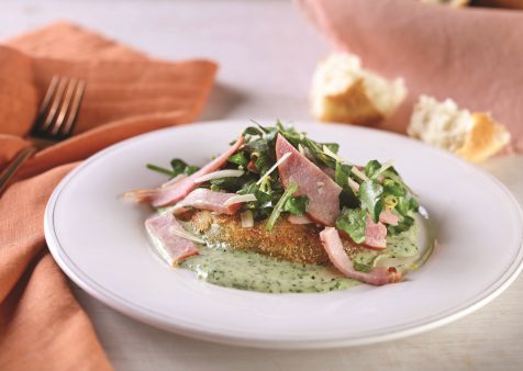 - Plate Green Goddess Dressing (recipe follows), topping with Fried Green Tomato (recipe follows). Add watercress and ham salad on top. Freshly grate lemon zest and Parmesan cheese over salad.