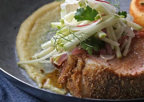- Drizzle with 1 Tbsp. Cider Gastrique per plate. Top with Apple-Fennel slaw.