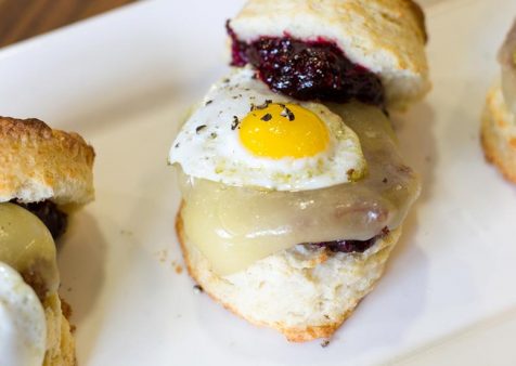 - For each plate, place sausage on bottom of biscuit and top with quail egg. Rest top biscuit on the side of the built biscuit.
