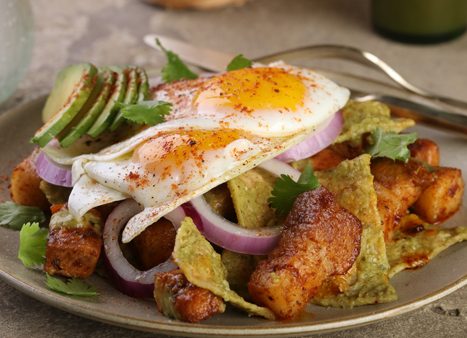 9. Cilantro, sour cream, lime, avocados and red onions can all be used as garnish on top and around chilaquiles.