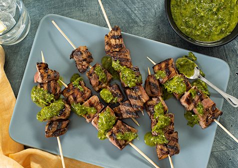 - Thread pork on skewer and serve with Chimichurri sauce.