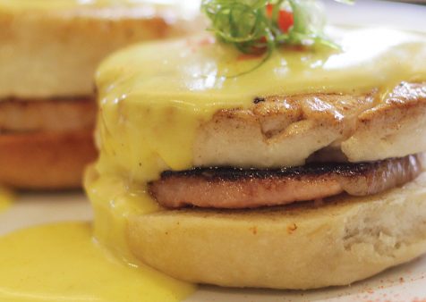 2. In a hot sauté pan, quickly sear the ham slices and keep warm.