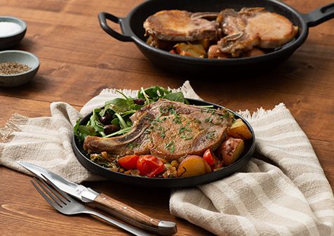 - 2 hot-boned, Bone-In Center Cut Pork Chops, seasoned with sea salt and pepper