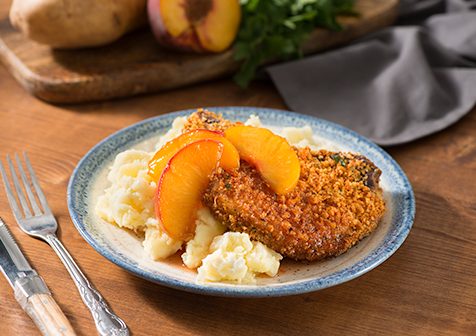 9. Divide pork chop and mashed potatoes among six plates. Add peaches and sauce on top of pork chops.