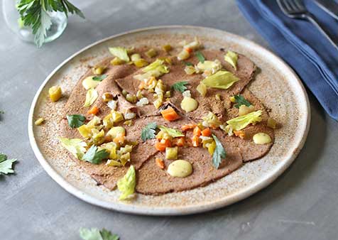 7. Sprinkle porcini powder over entire plate of beef. Scatter giardiniera over beef and garnish with chopped lovage and parsley.