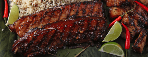 A slow-roasted pork dish marinated in acidic citrus with annatto seed, wrapped in a banana leaf; from the Yucatán Peninsula of Mexico