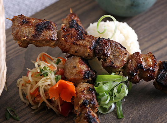 Meat marinated, skewered and grilled over a wood-burning or charcoal fire, satay is a dish of seasoned meat served with a sauce. A dish of Southeast Asia, satay may consist of diced or sliced pork, chicken, goat, mutton, beef, fish, even tofu and more.