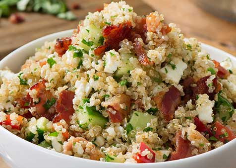 - Once quinoa has chilled, combine with bacon, bacon drippings, and remaining ingredients. Mix well and adjust seasonings if desired.