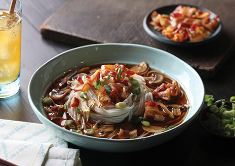 3. Place 1 ounce cooked noodles, 1 slice bacon and 1/6 cup Bacon-Fat Mushrooms in each bowl.