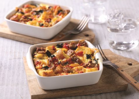 - Combine sausage, cheddar, spinach, tomatoes, milk, eggs and bread, and let sit for 5 minutes.