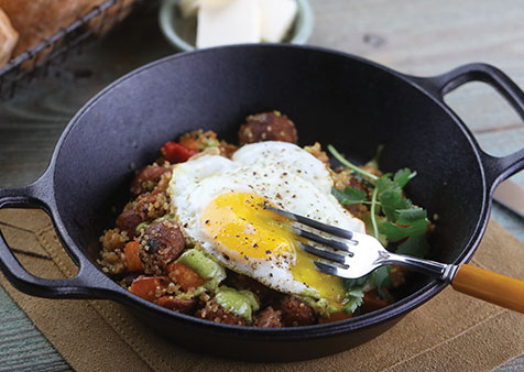 - Add minced garlic and shallots, along with chorizo mixture, and cook 1-2 minutes until again beginning to brown. Add cherry tomatoes and quinoa, and sauté 1-2 more minutes. Portion hash into dishes.