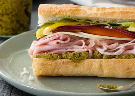 2. Top with ham, lettuce, tomato, onion, peppers and cheese. Place crown of bread on sandwich to serve.