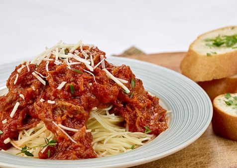 - Remove meat from sauce; pull apart or roughly chop and return to pot. Season sauce with salt and pepper. Serve on pasta or open-faced on thick slices of toasted Italian bread. Garnish with freshly grated Parmesan and fresh thyme leaves.