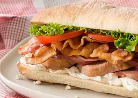 7. To assemble the sandwich, spread 1 tablespoon of garlic and herb cheese on the bottom half of a ciabatta roll. Next, layer 1/4 of the sliced tenderloin, then top with red onions, lettuce, cooked bacon and the top half of the ciabatta roll.
