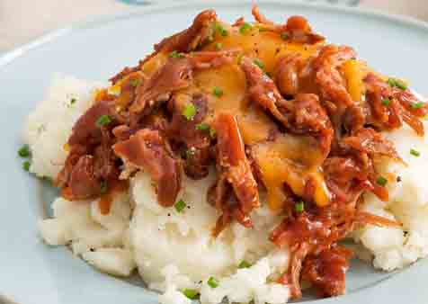 - Arrange 2 scoops heated mashed potatoes on plate; top with pulled pork. Sprinkle with cheese before serving.