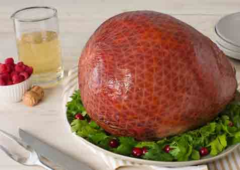 - To serve, slice ham and drizzle with 1 ounce warm raspberry sauce.