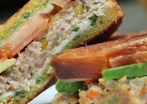 - To assemble sandwiches, spread 1 tablespoon of pesto on each slice of 12 slices of bread. Cover pesto with 1 slice of cheese, 1 slice of meatloaf, 1slice of tomato and 3 slices of avocado. Close the sandwiches. In a large non-stick skillet or preheated griddle or flattop melt 2 tablespoons of butter and griddle sandwiches until browned on both sides, turning once.