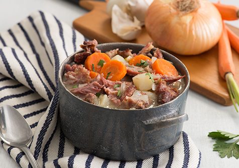 2. Remove neck bones from liquid; set aside. Strain liquid to remove any bones; pour liquid back into large pot. Add remaining 1 tablespoon salt, 1 teaspoon black pepper, 3/4 cup onion, 1 tablespoon garlic, potatoes and carrots; stir. Remove meat from neck bones; add back to stew.