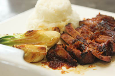 - First pinch salt & pepper lightly on Farmland® Boneless Ham-Eye Pork Chops. Rub approximately 1 tbsp. of glaze on each chop. Sear in a hot, heavy bottom skillet on both sides before applying more Soy-Ginger glaze. Continue to sear to a brown and black at edges color. Finish with more glaze and place in hot oven to finish cooking for an extra 4 to 5 minutes as needed. Serve with steamed rice seared & seared roasted baby bok choy. Drizzle Soy-Ginger Glaze over each chop and on plate. To cook bok choy, cut baby bok choy with stem in halves or quarters. Season with sesame oil & salt and sear with canola oil and place in low oven till tender, approximately 15 minutes.