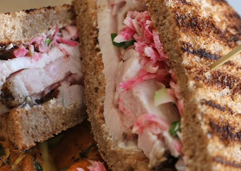 1. To assemble sandwich, spread Horseradish Mayo on toasted rye bread. Add sliced spice-crusted Pork, top with Marinated Watermelon Radish and top with other slice of break. Serve warm.