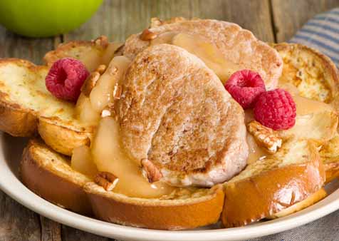 - Place heated pork loin in center of French toast. Spoon apple pie filling over top and sprinkle with pecans.