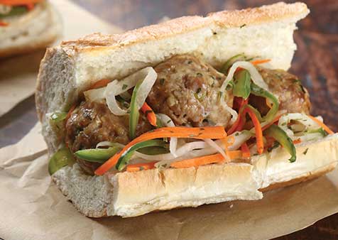 - Cut each baguette in half lengthwise, but don’t cut all the way through, leaving a “hinge” on one end. Spread Spicy Mayo on inside of each piece of bread. Stuff each sandwich with 1⁄4 of the Meatballs, 1⁄4 of the pickled carrot and daikon, and sliced jalapeños and cilantro.