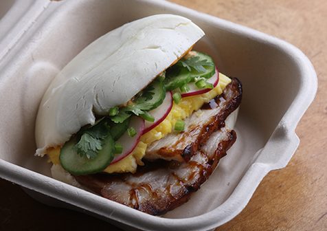 - On Bun, place sriracha, one piece of belly, eggs, cucumber, Radish, Cucumber and hoisin.