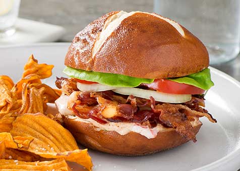 - On bottom half of the pretzel bun, spread chipotle mayo and layer with bacon, lettuce, tomato, onion, and avocado.