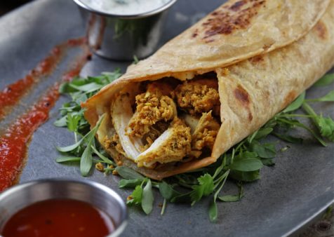 - Roll it up tightly like a wrap and cover with foil. Serve with: Tomato Jam, Green Chile Chutney and Cucumber Raita.