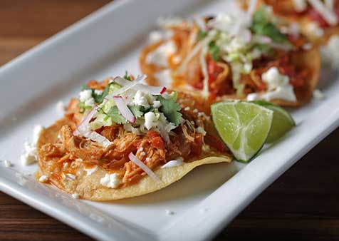 5. Spread tostada with sour cream. Top with chicken tinga. Garnish with shredded lettuce, cilantro, avocado and a squeeze of fresh lime