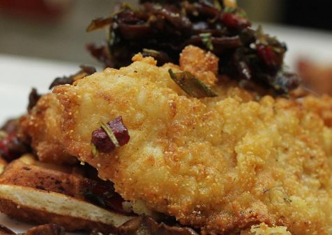 13. Serve 2 pork slices on top of a waffle, spoon ¼ cup mushrooms on top.