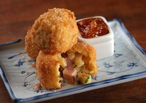 1. Warm béchamel until it begins to simmer. Once hot, remove from heat and whip in 3 cheeses until smooth, followed by macaroni, diced ham and egg yolks.