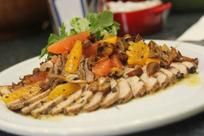 - Remove the cooked Pork Flat Iron from the extra virgin olive oil and allow to rest in a warm place until needed for service. Slice thin and arrange onto a plate along with desired salad options.