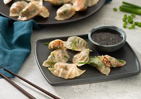 1. Place a pot sticker wrapper on a clean work surface and place a large teaspoon of the filling in the center of the wrapper. Brush the edges of the wrapper with water. Fold the wrapper over to form a semi-circle. Press the edges to adhere. Using your hands, make small pleats or folds to close and seal the pot sticker. Set aside and keep completed pot stickers covered with a slightly damp towel.
