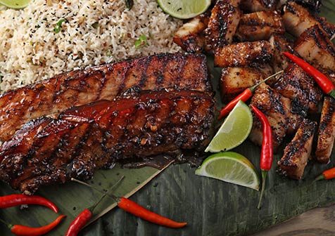 - To serve, arrange banana leaves on platter. Place Garlic Fried Rice followed by Pork Belly; top with additional Adobo Glaze. Garnish with fried garlic and key lime or kalamansi wedges.