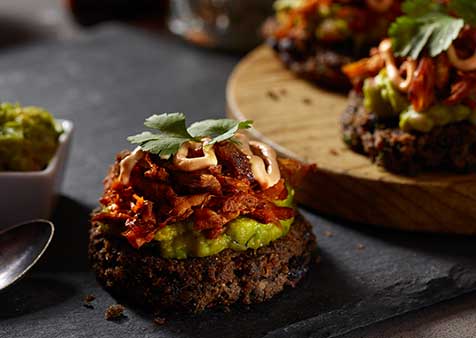 1. Top each cake with your favorite guacamole, then crispy Roasted & Seared Pork Shoulder, and finish with a chipotle crema and chopped cilantro.