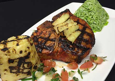 - On six plates, place pork chop and cilantro rice. Add grilled pineapple on top of each pork chop and garnish with a sprig of cilantro.