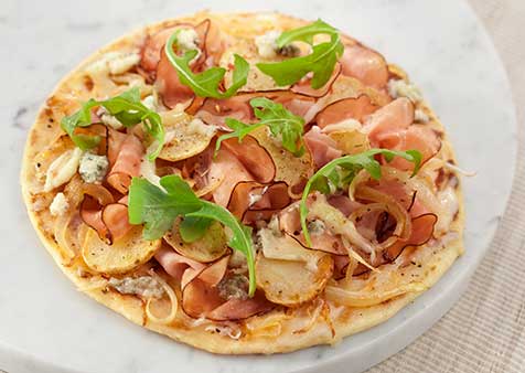 2. Spread caramelized onions over flatbread, then top with potato slices, ham, Gorgonzola, and Fontina cheeses, making sure to evenly distribute the ingredients.