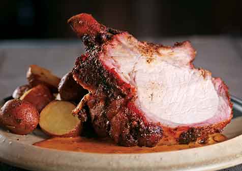 Herb-Crusted Smoked Rack of Pork with Drip Pan Potatoes